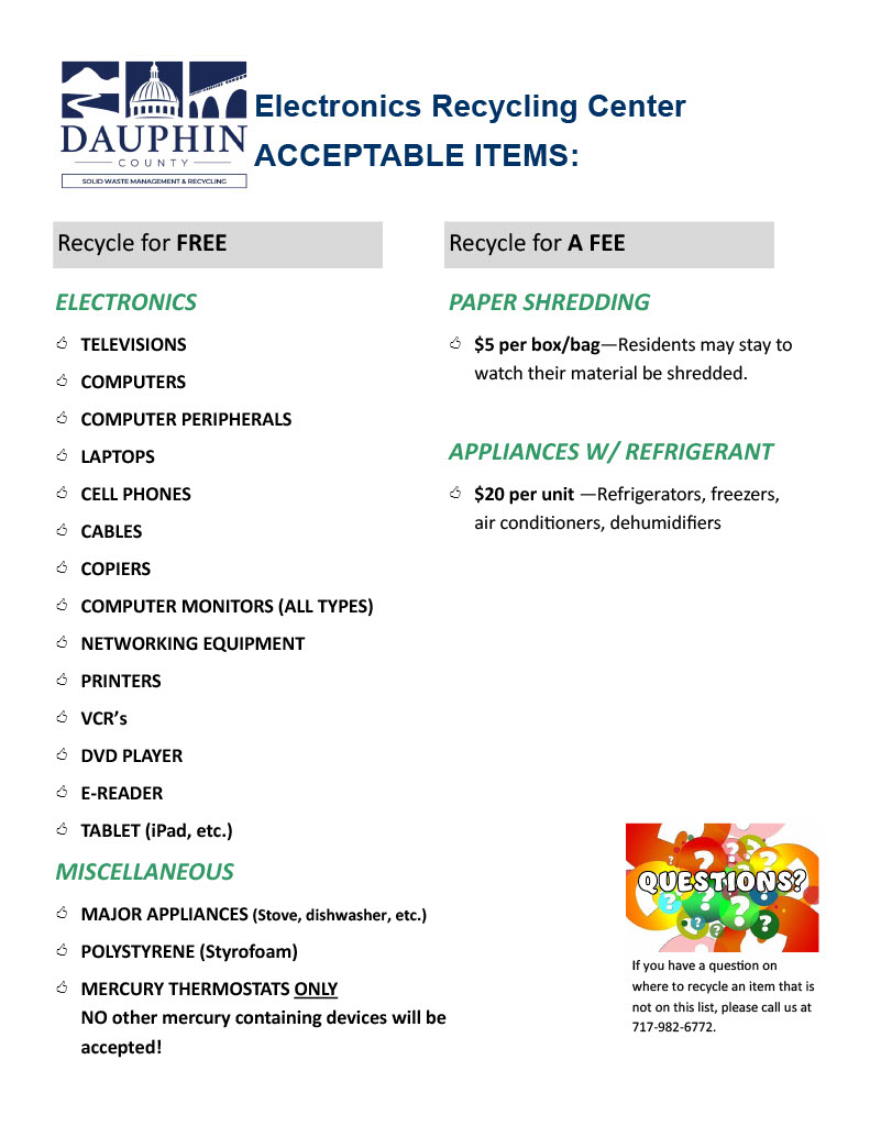 The Dauphin County Board of Commissioners opened the Dauphin County Recycling Center (DCRC) in April 2009. The DCRC was established to offer a convenient drop-off location for residents, out-of-county residents, businesses, institutions, and local governments to recycle their unwanted or obsolete electronics or appliances, old thermostats containing mercury, and an on-site confidential document shredding service.