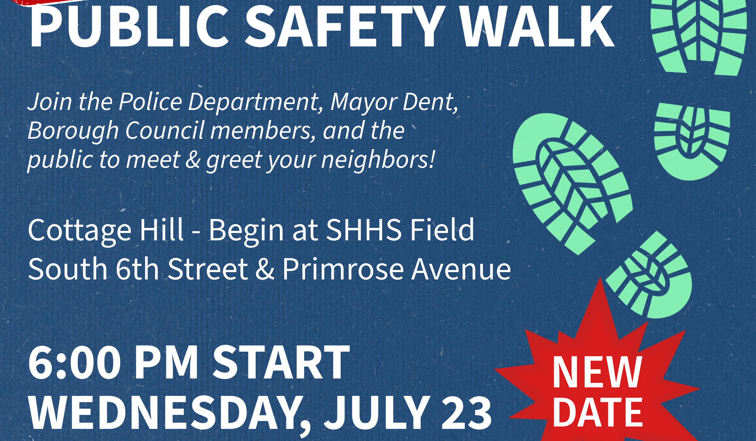 The Public Safety Walk on Cottage Hill, originally scheduled for Wednesday, July 9, 2025, has been postponed due to forecasted inclement weather. The event has been rescheduled for 6:00 PM on Wednesday, July 23, 2025.